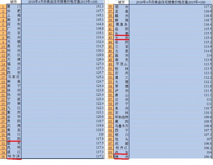 如果看排名,丹东、锦州的2018年4月住宅商品住宅价格相比2015年是全国最低的,按此看丹东环比2018年房价涨幅全国第一,也说明有补涨的因素。
