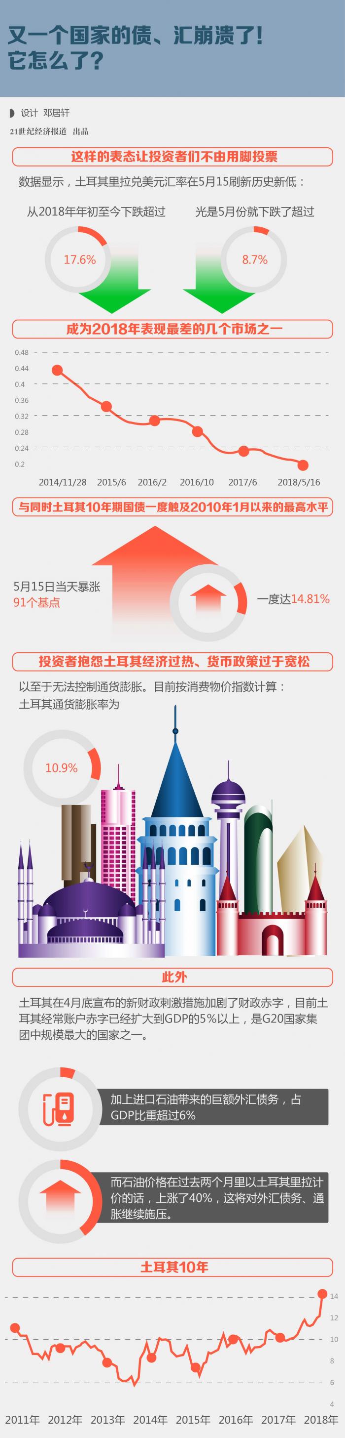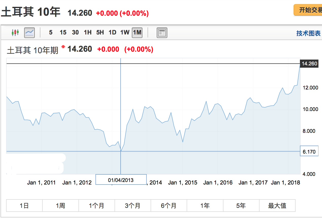 与同时土耳其10年期国债一度触及2010年1月以来的最高水平,5月15日当天暴涨91个基点,一度达14.81%。
