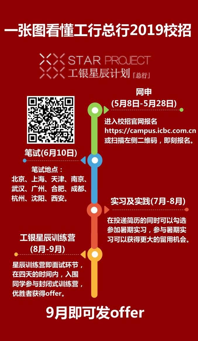 2018年5月8日,中国工商银行总行本部发布2019年度校园招聘启事,推出“工银星辰计划(总行)”,提前启动秋季招聘,拉开了新一轮银行招聘季的序幕。