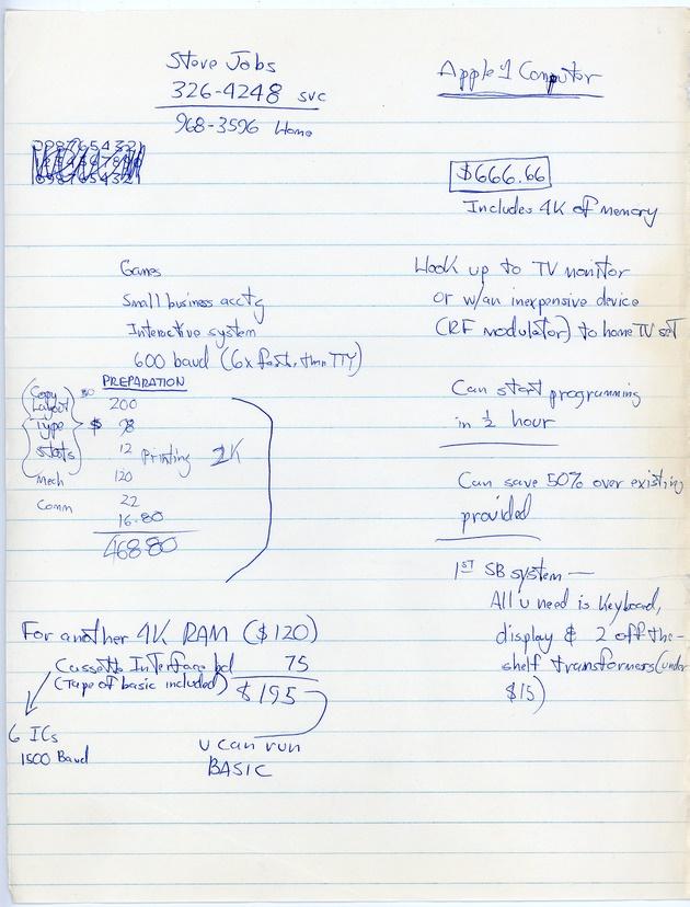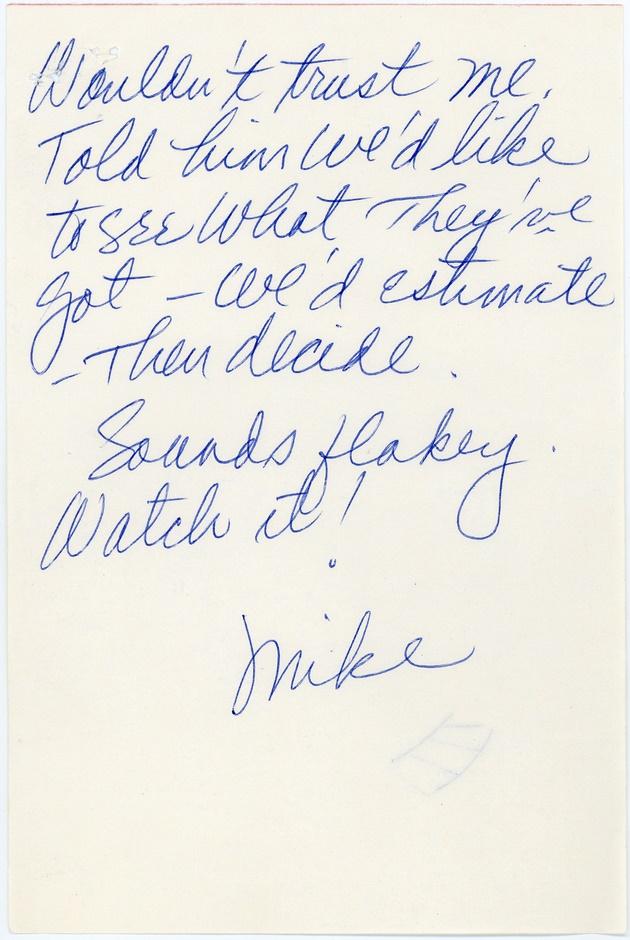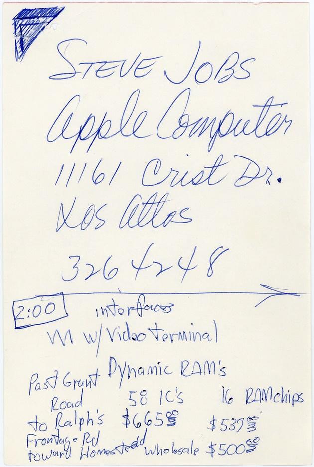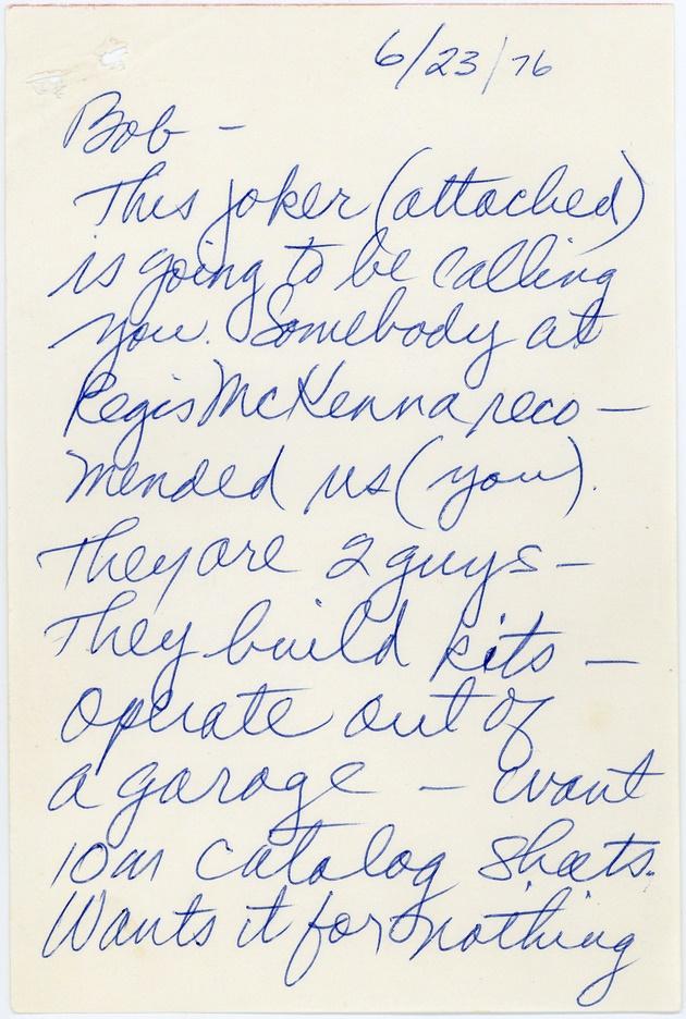 “Regis McKenna的人把我们推荐给他。他们有两个人,产品是电子设备,他们在车库里经营。他们想要我们的目录表。他不肯相信我。我对他说我们要看看他们的产品,然后才能决定。他看上去像个怪人。小心一点!”