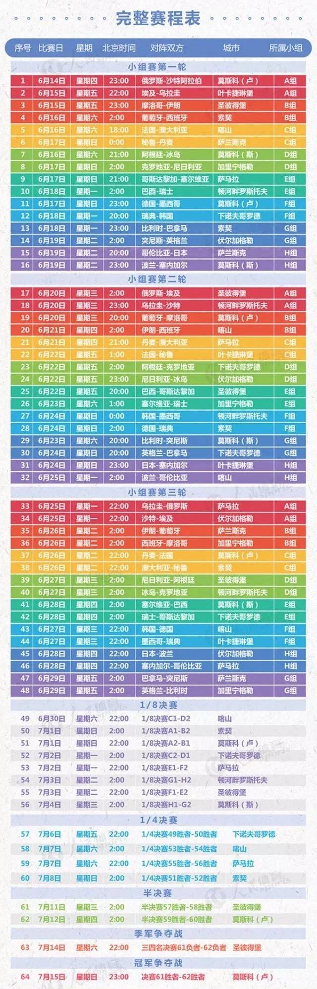 3、2018俄罗斯世界杯将于北京时间6月14日至7月15日举行,64场比赛在11个城市的12座球场进行。