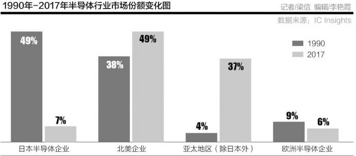 数据显示,依照营收,1990年时,日本曾占据着全球十强半导体企业中的六席,日企在全球市场的份额亦达到了49%;而到2017年,该榜单上已仅有东芝一家,日企的市场占有率也在该年降至了7%。取而代之的是北美企业,其市占率同期由38%提升至49%,在全球十大半导体企业中也占据了半壁江山。此外,除日本外的亚太地区的市场份额也从4%跃升至37%。
