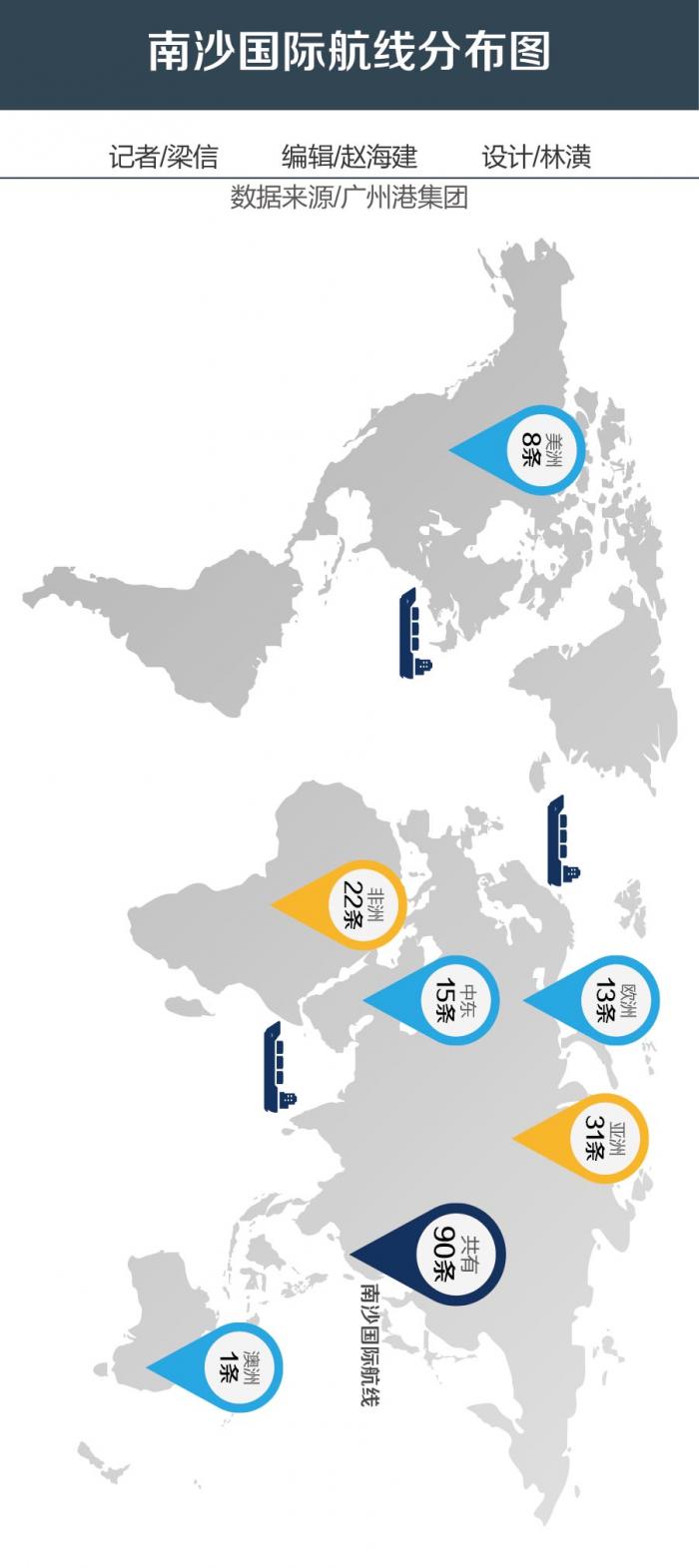 在航线方面,南沙国际航线区域分布并不均衡,航线目的地以非洲和亚洲港口居多,尤其是“一带一路”沿线上的港口为主,而欧美航线较少。广州市美信国际货运代理有限公司副总经理余文尓在接受21世纪经济报道记者采访时表示,实际上,对于南沙港辐射区域内的企业来说,在南沙港走远洋运输的成本是更低的,但现在航线不够多,客户选择范围并不大。