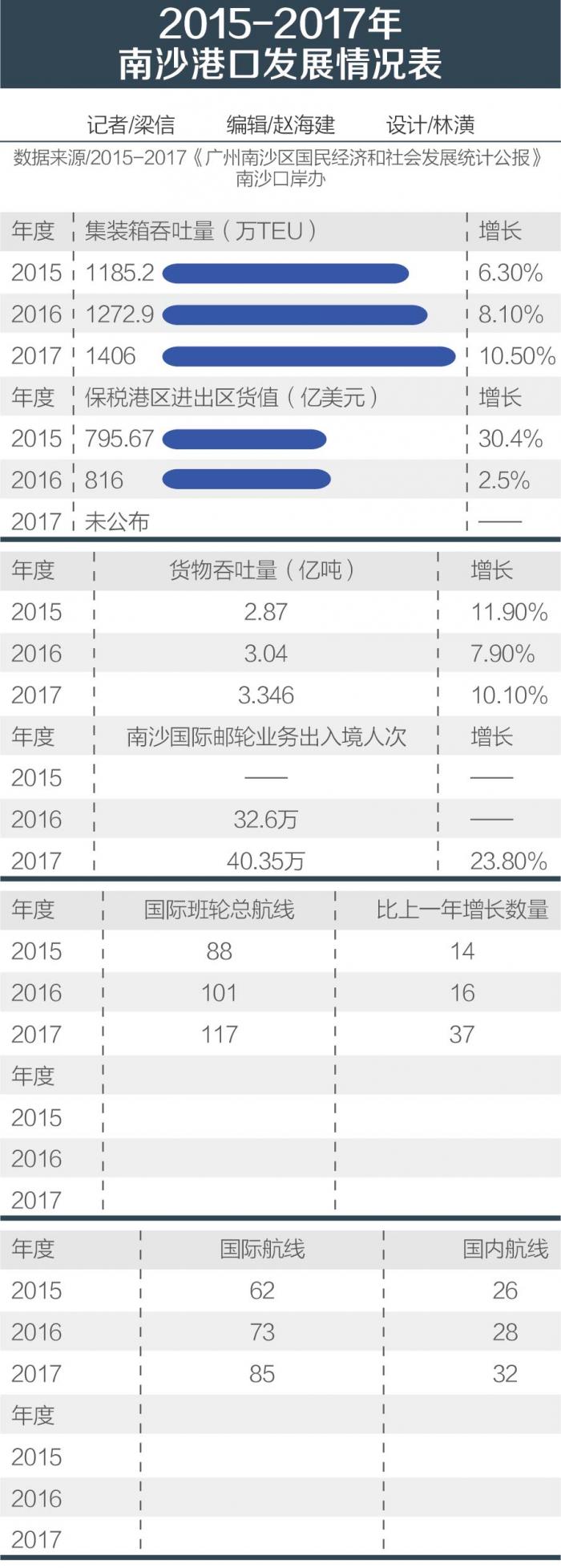 同时,南沙的国际邮轮业务发展势头也正迅猛。广州港股份有限公司向21世纪经济报道记者提供的资料显示,丽星、星梦、歌诗达等邮轮公司已在南沙港区开通越南、香港、日本三条国际邮轮航线,2017年邮轮停靠122艘次,旅客进出港达40.35万人次,同比增长23.8%,居全国第三。“2018年,南沙的目标是要突破50万人次。”宋小明对记者表示。