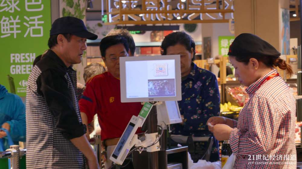 上海,le Marche超市。一位顾客进行自助结账区。在收银区,通过人脸识别功能,消费者可以自主扫码支付。该系统整合了人脸识别、会员认证、免密支付等核心技术,让消费者可以通过“刷脸”完成会员注册与绑定、结账免密支付,在提供便捷时尚的智慧体验的同时,也保障了支付的极高安全性。此外,店内还引入了腾讯智慧零售“扫码购”,顾客消费时可以买一件扫一件,决定好所有购买的物品后,一键微信支付,可避免排队结账,提高交易率。