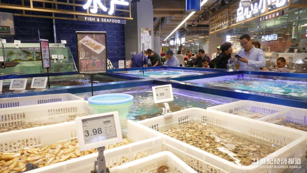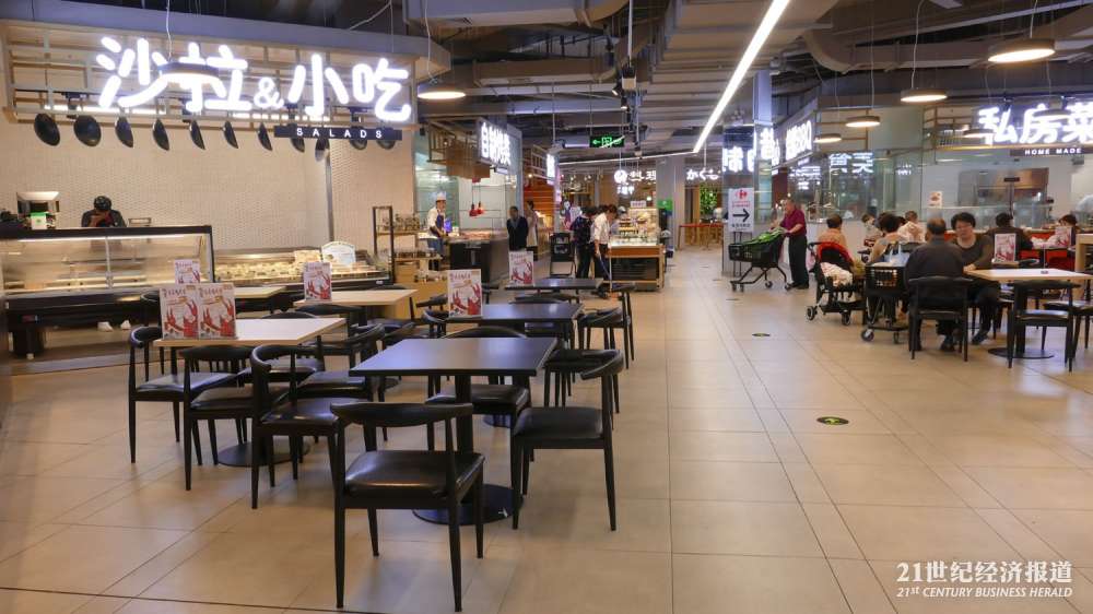 上海,le Marche超市餐饮区。进入超市顾客可以购买生鲜、现场加工现场享用,这点和盒马有点相似。