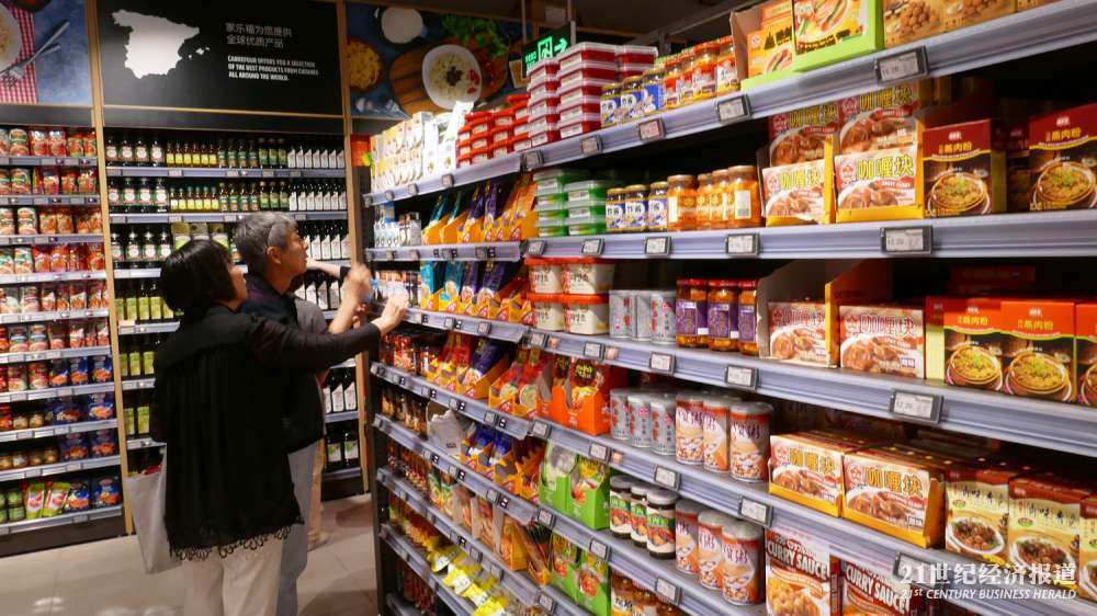 上海,le Marche超市进口食品区,一对老夫妻在选购商品。