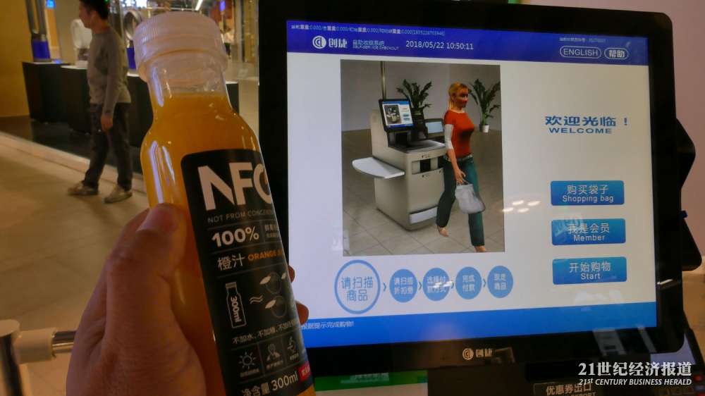 上海,le Marche超市。除了人工收银外,店内还提供有自助结账区。