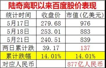 百度CEO陆奇离职的消息是上周五(5月18日)发布的,周五晚美股开始出现大跌,一度跌幅超过10%,收盘大跌9.54%。