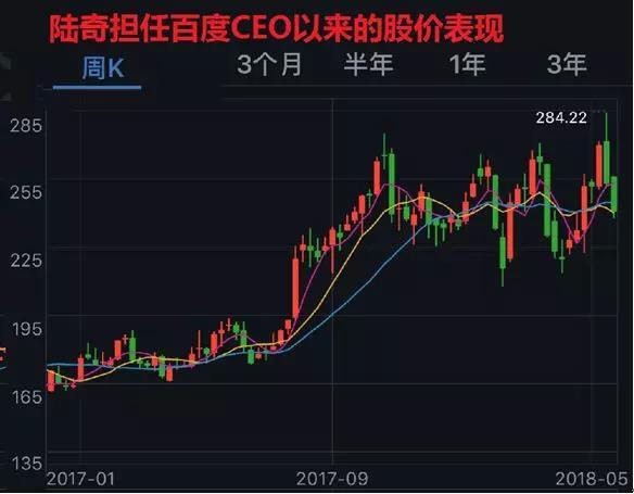 陆奇500天前从微软全球副总裁的职位上跳槽到百度CEO,近500天时间里,百度的股价从170美元左右上涨到最多的284美元,市值从600多亿美元增加到近1000亿美元。