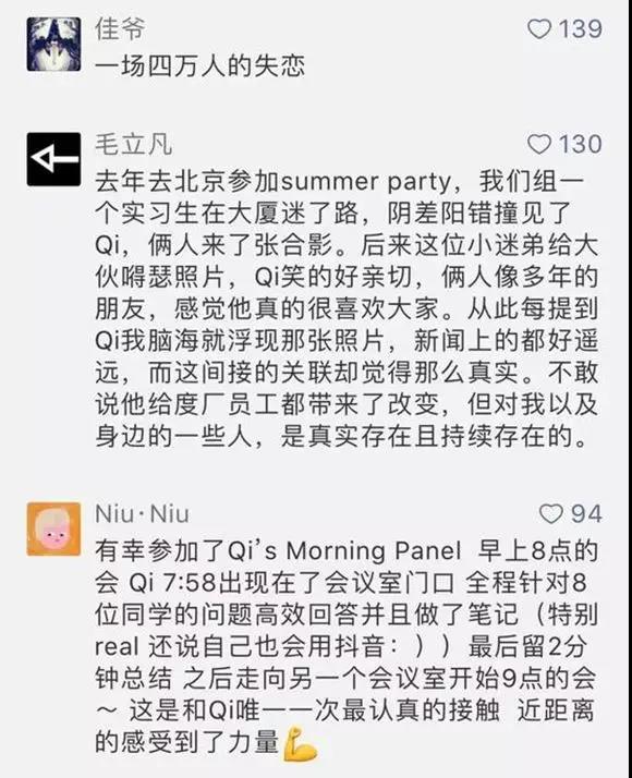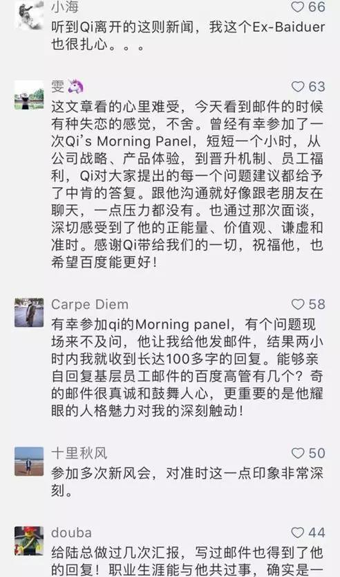 关于陆奇的文章下很多百度员工的留言,更有人直言,陆奇的离职是一场四万人的失恋: