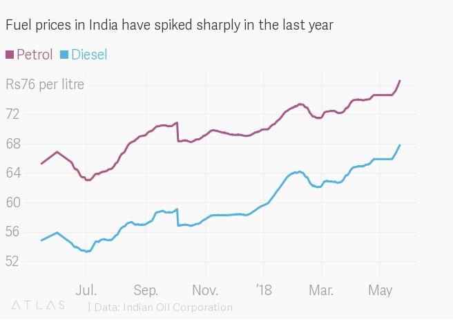 5月14日以来,由于印度的汽油零售商将全球油价上涨的压力转嫁给消费者,印度汽油和柴油价格已经在八天内连续上涨。由于此前卡纳塔克邦议会选举,油价市场曾有十九天暂停上涨的“喘息”,但随着最近选举落幕,基本控制了整个印度燃油市场的印度国有石油公司再次恢复价格上涨。