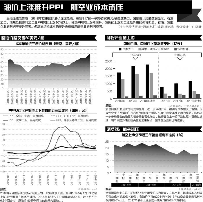 国际油价在5月17日站上80美元/桶整数关口、创下三年半新高后,一直在附近高位徘徊。油价上涨带来的影响正在传递到经济的各个层面。市场正密切关注,各国央行是否加快货币政策收紧步伐——来应对油价上涨与通胀骤然回升压力。而从历史数据来看,油价的波动对各主要行业的PPI均有一定影响。上游行业受益于原油价格上涨目前已到达盈利拐点,国内两大石油巨头中石油和中石化持续提高资本性支出;油服方面,国外三大油服巨头经营数据均较上年同期有大幅增长,受制于滞后性国内企业盈利的改善很快也将得到体现。中下游行业盈利则普遍因油价上涨而受损;消费端的航运和航空业成本中燃油占比普遍接近3成,承受压力也较大。(林虹)