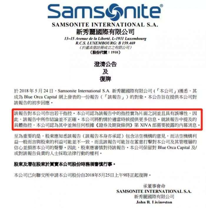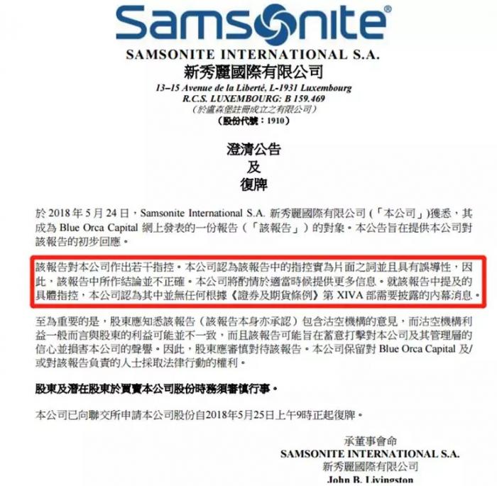 做空新秀丽的机构叫做Blue Orca Capital,执掌人是之前“战绩辉煌”的做空机构Glaucus研究总监Soren Aandahl。早在5月17日,Soren Aandahl便撂下狠话,“公司成立新沽空基金Blue Orca,并宣称锁定一只港股为基金首个目标,该股市值规模之巨超越之前所狙击过的港股。”