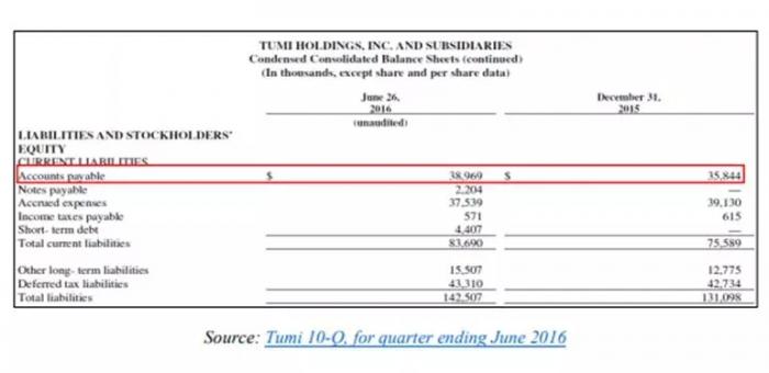 关于收购TUMI时虚增应付账款1个亿:在被收购前一个月,TUMI的最新财报表示应付账款只有3897万,且价值的确定性是非常高的。但新秀丽在收购TUMI时,提供的报表显示TUMI的应付账款有1.39 亿元。