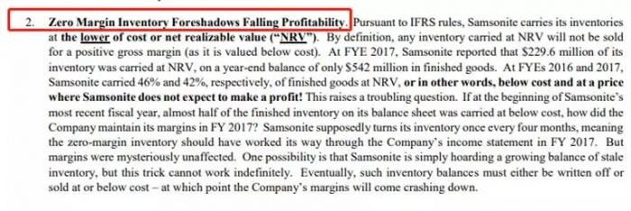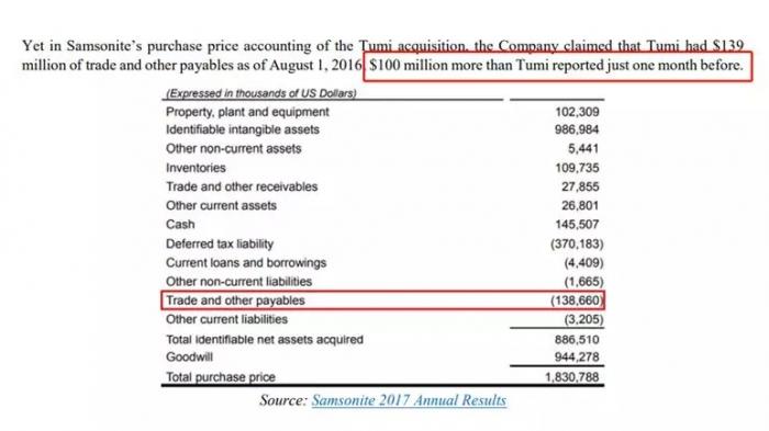 Blue Orca提到了三点,一是18亿美元收购TUMI时虚增应付账款,二是收购TUMI亚洲分销商时低报存货,三是存货大幅减值。