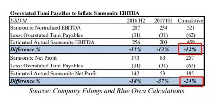 Blue Orca认为新秀丽的管理层在造假,通过虚增应付账款,把一部分费用从利润报表上面挪出,从而达到虚增利润的效果。如果把这笔费用计入,Blue Orca认为新秀丽的EBIDDA要低12%,净利润要低24%。