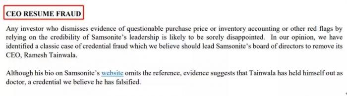 新秀丽CEO,Ramesh Tainwala,在各场合都自称自己是一名博士,但实际上他从未获得博士学位,只是在1992年-1993年期间参与了学院的一个项目而已。Blue Orca称这种造假足以将Tainwala从CEO位置上拉下来。