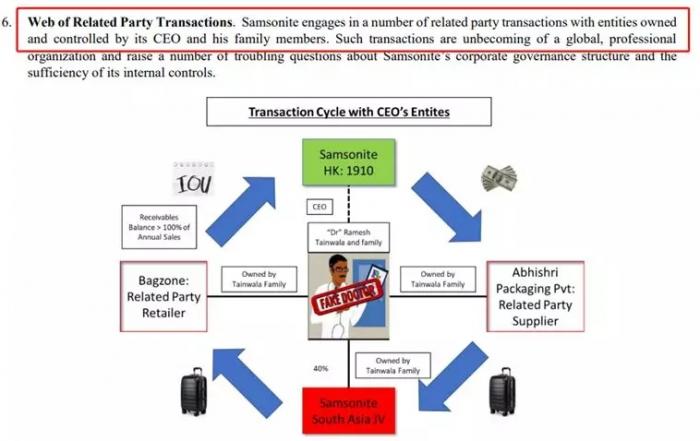 Blue Orca指出,从审计角度来说,新秀丽有很多猫腻,关联交易有很多问题。