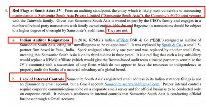 比如新秀丽南亚合营公司(South Asian JV),该公司由新秀丽与Tainwala家族合营,股权分配是60%和40%。按道理,这种关联交易,新秀丽的审计团队应该高度监视,但实际上并没有:请的审计是印度注册的小公司,连个网址都没有;南亚也缺乏内部管理等等。