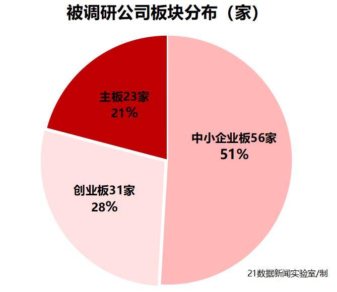 统计显示,被机构调研的这110家公司中,属于中小板的有56家,属于创业板的有31家,另外23家来自主板。中小创仍是机构调研的主要对象,占据近8成。