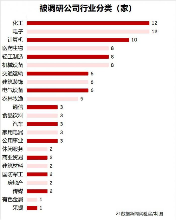 从行业分布来看,电子、化工行业最受机构青睐,相关调研公司均为12家。计算机则有10家公司获得机构调研。