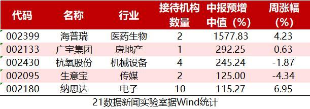 业绩方面,在上述110家调研个股中,有5只中报业绩预增100%以上,其中海普瑞中报预增十倍以上,公司预计2018年1-6月归属于上市公司股东的净利润盈利1.1亿元-1.4亿元,同比增长1376.49%-1779.17%。