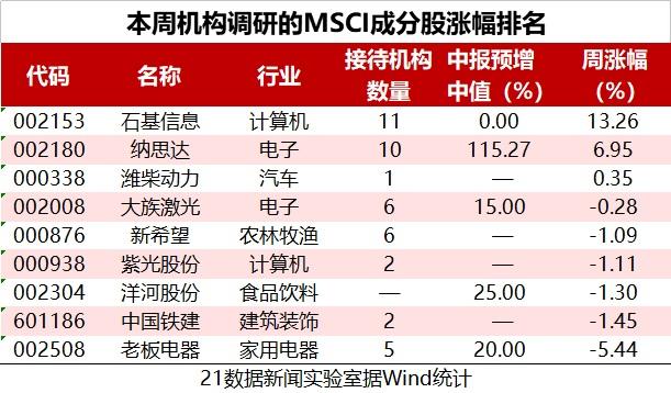 6月1日,MSCI将正式纳入A股。在5月15日MSCI纳入A股最终名单确定后,MSCI成分股也成为机构调研的重点对象。统计显示,本周有9只MSCI成份股被机构调研。其中大族激光有3次调研记录,中国铁建被调研两次,纳思达为MSCI本次新增成分股,本周股价上涨6.95%,中报预增中值115%。
