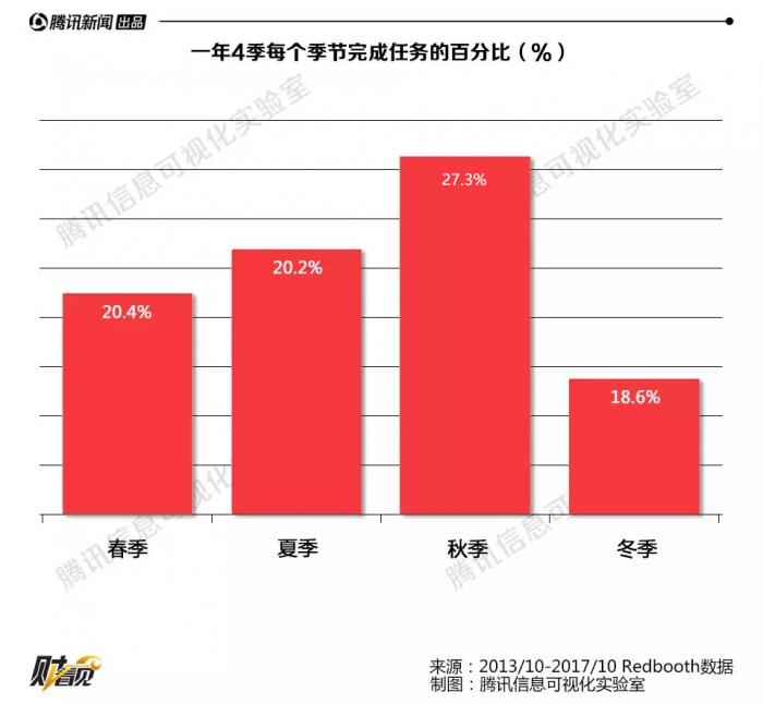 秋天是我们工作效率最高的季节,冬季则是我们工作效率最低的季节,冬季完成的工作任务占全年的22.8%。