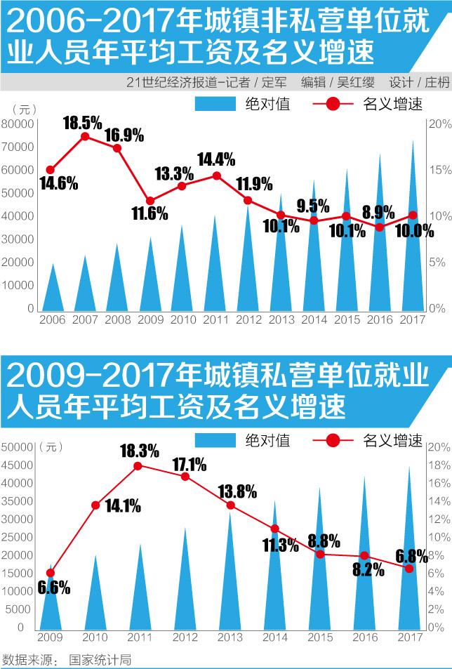 国家统计局数据显示,2017年全国城镇非私营单位就业人员年平均工资为74318元, 同比名义增长10.0%,增速比2016年加快1.1个百分点。扣除物价因素,实际增长8.2%。