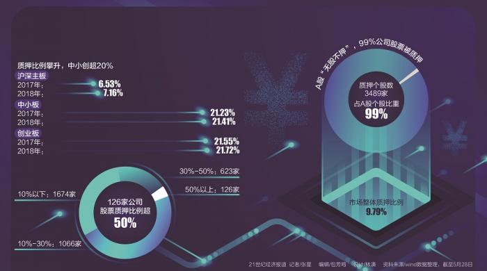 截至5月28日,A股共有3489家上市公司的股东有质押股票情况,占比99%。股票质押是热门的融资工具。其中股票质押比例超过50%有126家。