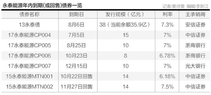 据21世纪经济报道记者梳理,除了即将到期的“13永泰债”之外,永泰能源今年还有“17永泰能源CP004”、“17永泰能源CP005”等4笔短期融资券即将在年内到期,发行规模合计43亿元。“15永泰能源MTN001”、“15永泰能源MTN002”两笔中期票据将在10月以及11月进入回售,规模共计28亿元。