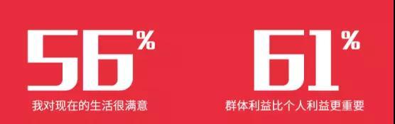 他们关怀他人,由于独享父母的爱和资源,56%表示“对现在的生活很满意”;而且他们看到社交平台上的不同意见,发出同理心,有精力去关心自己的群体,61%表示“群体的利益比个人利益更重要”,并且会做出行动。