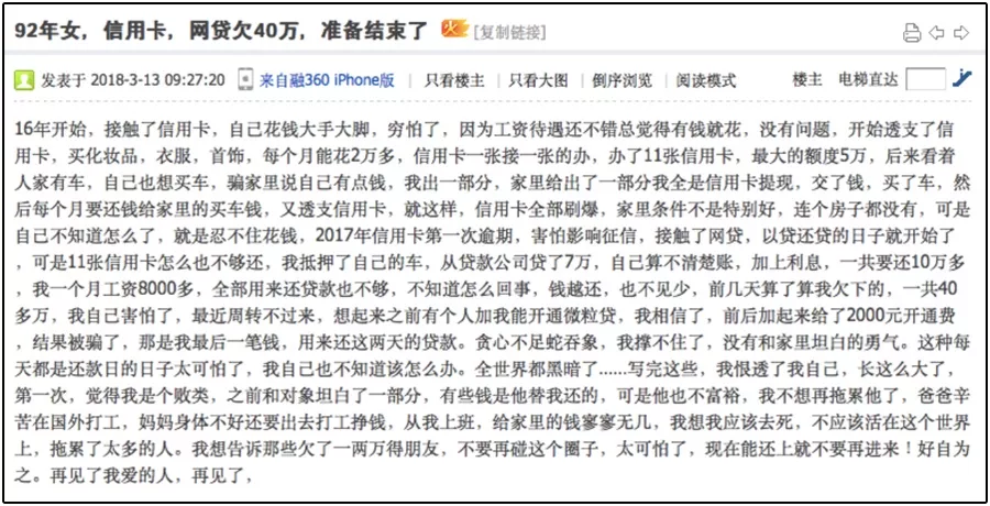 而这“水泥”,就是这样的金融操作背后的手续费、利息,还有就是个人资金链断裂的风险。我们来看个真实的案例,虽然这些都属个案,但还是要控制好自己借钱过日子的欲望啊: