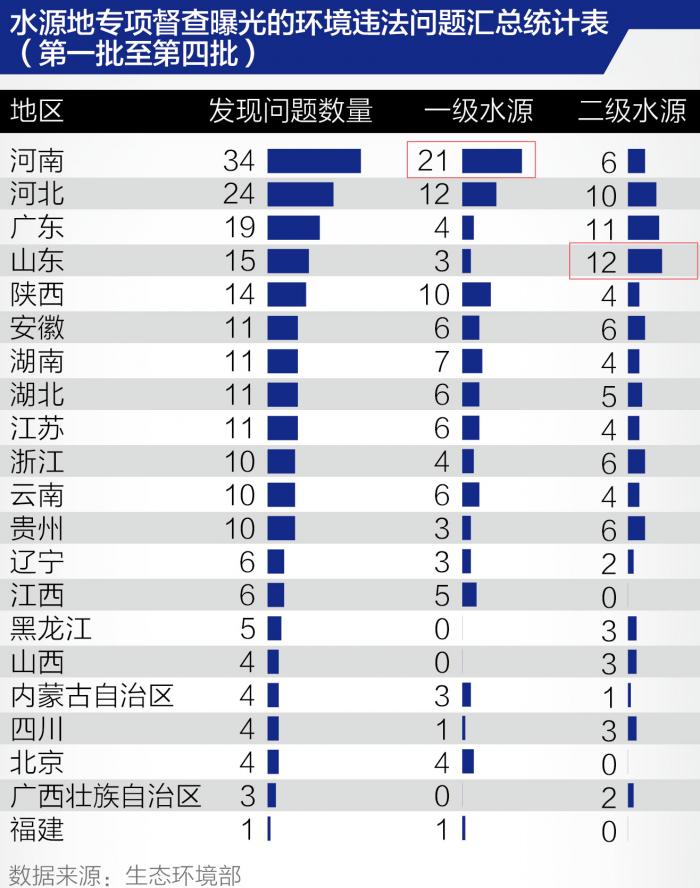 根据生态环境部公开的数据,21世纪经济报道记者统计发现,截至5月29日晚,生态环境部共分为四个批次一共曝光了21个省区市内存在着217个水源地污染问题。其中,涉及上述水源地一级保护区的问题105个,二级保护区的问题共计92个。