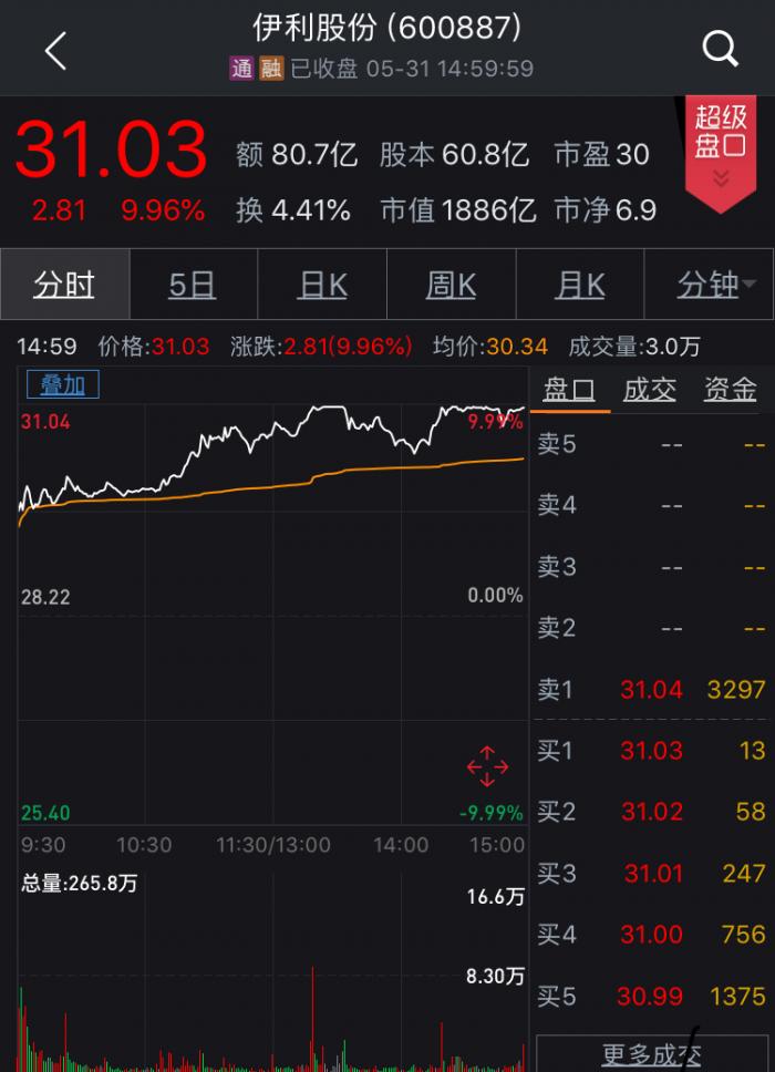 受此消息刺激,伊利股份5月31日盘后一度拉升至涨停,截至21世纪经济报道记者发稿,公司股价上涨9.96%,报31.03元/股。