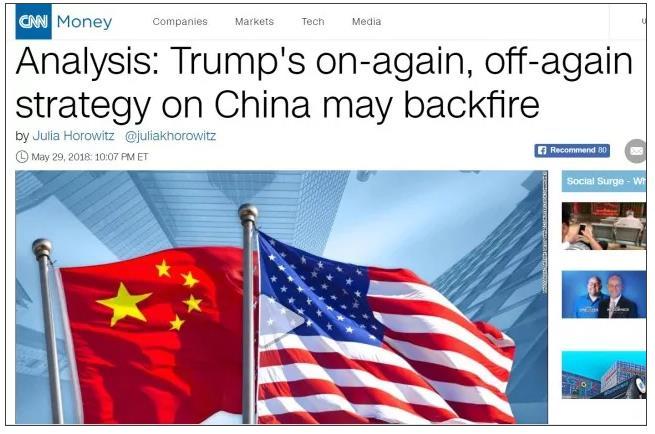 这不,美国最主流的电视新闻网CNN就在特朗普对中国“出尔反尔”后很快刊登了一篇专业的分析文章,并且在文章的标题中就明确地写到:“特朗普对中国变来变去的策略,很可能会反伤美国自己”。(见下图)