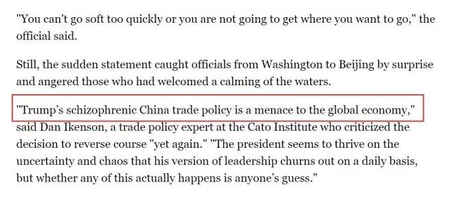 “特朗普对华贸易政策上展现出的这种【精神分裂症式】的态度,是对全球经济的祸害。”