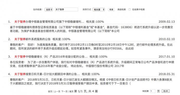 21世纪经济报道记者发现,中行官网上无法搜索到其他“关于暂停理财产品赎回申请”的相关公告。