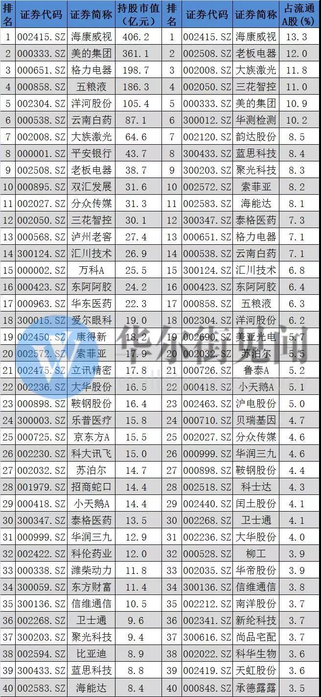 从占流通A股的比例看,占流通股比例较高的股票大部分也跟持股市值靠前的股票重合。海康威视获得“双料第一”,老板电器和大族激光分列二、三位。