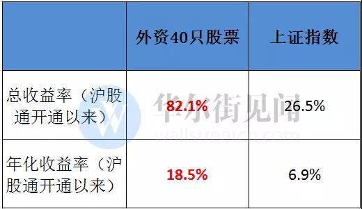 沪股通于2014年11月17日开通,过去三年半以来,外资最青睐的40家沪股通公司的回测总收益率为82.1%,年化涨幅18.5%;同时期内,沪指涨幅26.5%,年化涨幅6.9%。
