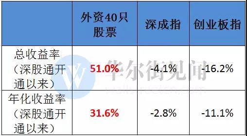 深股通开通后,外资持仓最多的股票回测涨幅为51%,年化回测收益31.6%,而同期的深成指跌幅-4.1%,创业板跌幅达-16.18%。