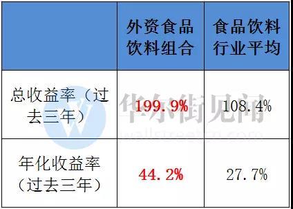 经统计,过去三年外资持股的食品饮料组合总回测收益率为199.9%,年化回测收益为44.2%;而过去三年,食品饮料行业的涨幅为108.4%,年化涨幅为27.7%。