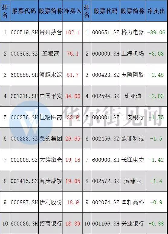 最近一个月,外资净买入和净卖出前十名的A股公司名单如下,单位同样为“亿元人民币”。