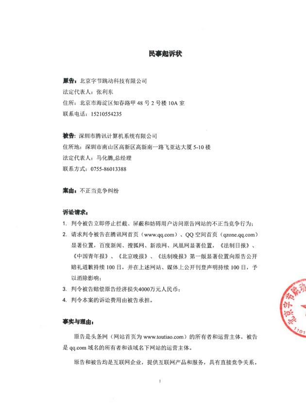 今日头条起诉腾讯:要求道歉并赔偿9000万元