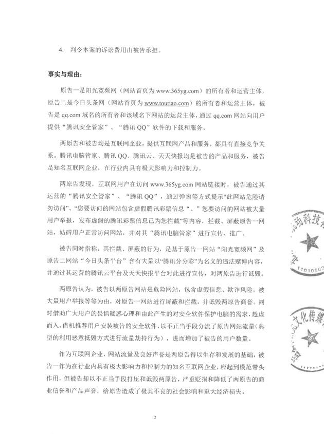 今日,今日头条官方表示,腾讯利用垄断地位以各种理由、多次进行不正当竞争的行为。针对其中的“腾讯QQ空间拦截、屏蔽头条网页链接” “腾讯安全管家作为安全软件拦截、屏蔽头条网页链接”,今日头条已经起诉腾讯,目前两案都已于6月1日获得海淀区人民法院立案相关证据都已经提供给法院,详见起诉状。