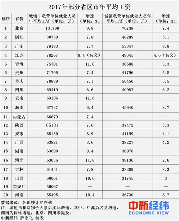 之后,各省份陆续公布当地的平均工资水平。中新经纬客户端梳理各地统计局数据发现,截至6月1日,全国至少有20个省份公布2017年城镇非私营单位、私营单位就业人员年平均工资水平。