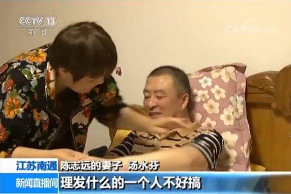 陈志远的妻子 汤水芬:他自己不能走,要搀着走,家里只有我一个人,帮他洗澡理发一个人不好搞。有时候就不洗,让他脏一点。