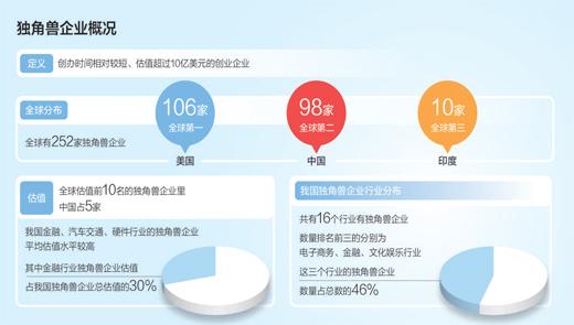 根据德勤发布的《中美独角兽研究报告》(以下简称《报告》),截至2017年6月30日,全球有252家独角兽企业,美国106家,占总数的42.1%,全球第一;中国有98家,占38.9%,全球第二,而排名第三的印度只有10家。