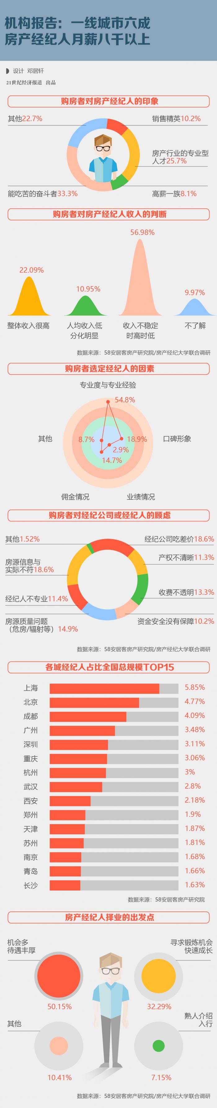 6月4日,58集团对外发布《58集团2018年百万房产经纪人生存报告》,该报告基于58安居客房产研究院和房产经纪大学的联合调研,样本来自58集团房产业务覆盖的全国近5万家经纪公司,以及超过110万的经纪人群体。报告全面揭示了经纪人群体画像、经纪人最新的工作和生活状态、以及他们对行业的认知情况,同时也展示了购房者眼中的经纪人形象。调研数据显示,一线城市60%的经纪公司给予房地产经纪人的月薪在8000元以上,普遍高于新一线城市。